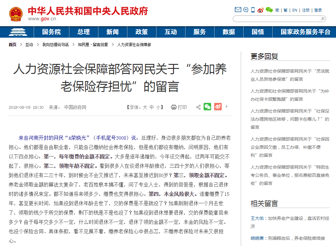 2019年8月5日,人力資源社會保障部在答中國政府網(wǎng)網(wǎng)民關(guān)于“參加養(yǎng)老保險存擔憂”的留言中表示: