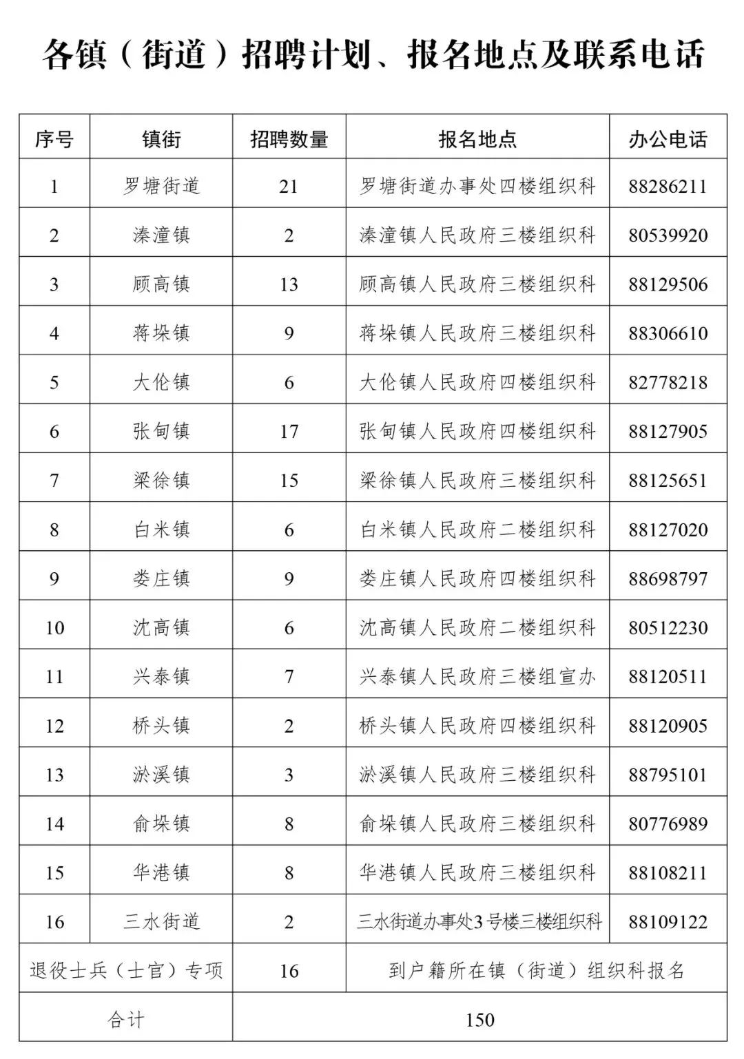 計(jì)劃選聘150名,其中:各鎮(zhèn)(街道)選聘134名;從2016年-2018年退役的士兵(士官)中專項(xiàng)選聘16名,(具體選聘計(jì)劃數(shù)量見(jiàn)附件1)。