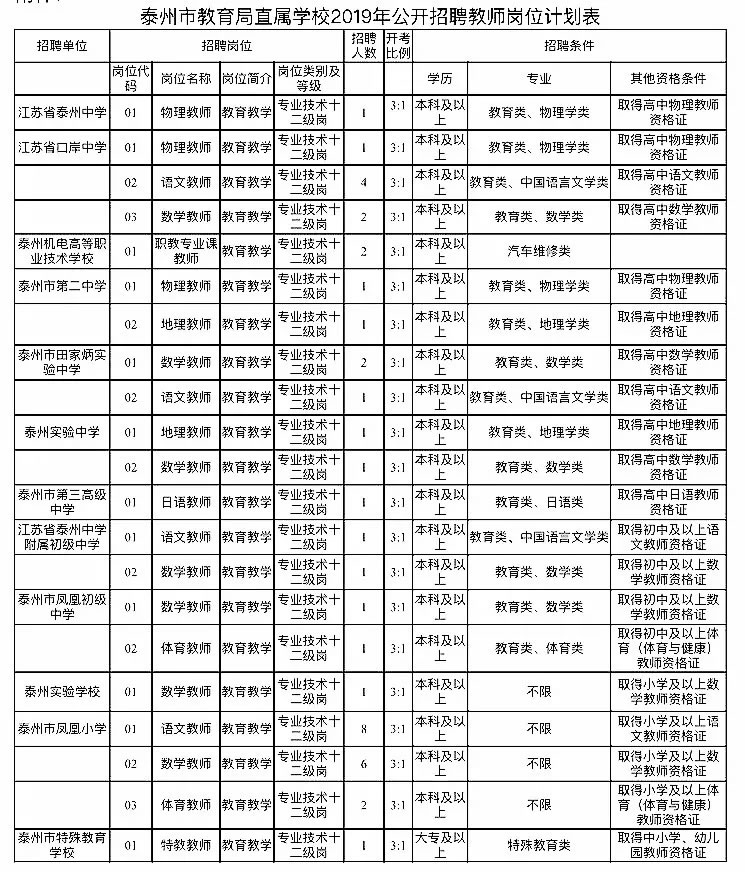 具體招聘崗位、計劃及相關(guān)要求詳見《泰州市教育局直屬學(xué)校2019年公開招聘教師崗位計劃表》(附件1,以下簡稱《崗位計劃表》)。