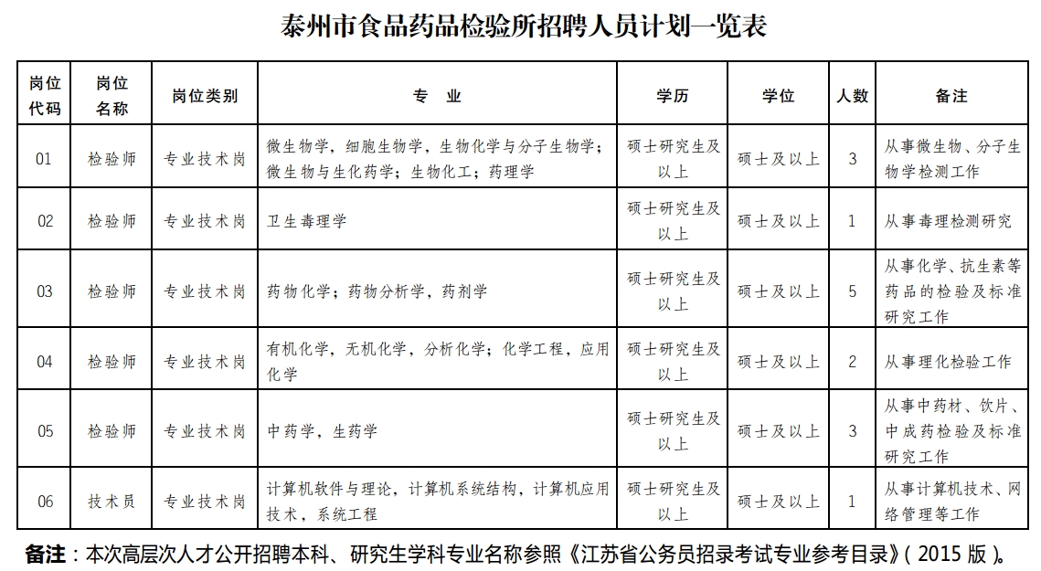 泰州市食品藥品檢驗所2015年高層次人才招聘公告
